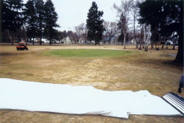 These photos were taken in the Spring of 2005 in Kalispell, Montana. You are seeing the turf as it appeared immediately following its uncovering. GreenJacket® IMPERMEABLE covers protect greens from ice damage, crown hydration, desiccation, and help to keep the turf dormant during those freeze-thaw-freeze cycles, resulting in healthy green turf in the Spring.